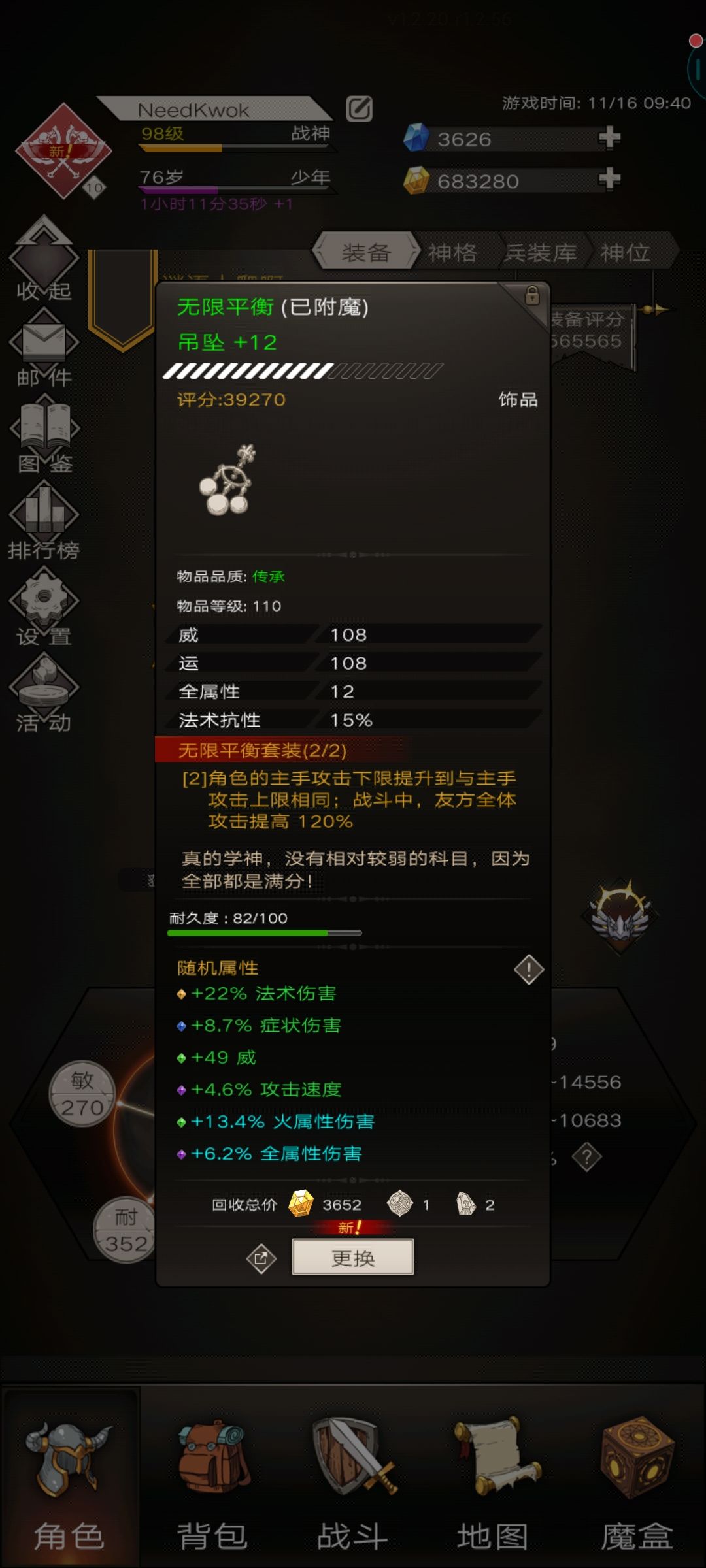 2.强度分析。目前我塔推到了164层,160以后每层是一个槛,在当前基础上提升50-100%伤害能多打一层。我目前的词缀已经达到了极限:魔边+平衡+30精算+24生生不息。但装备和神格还有的提升: