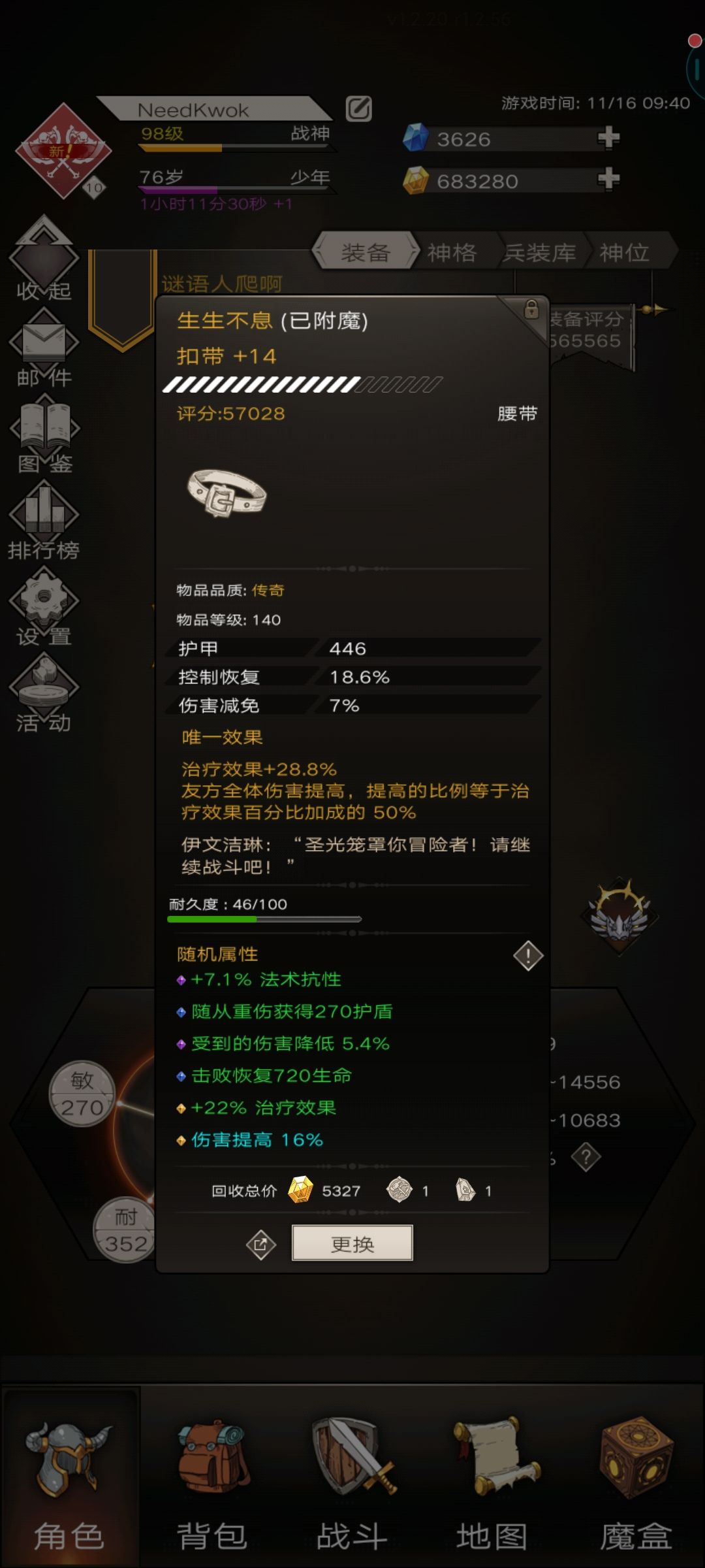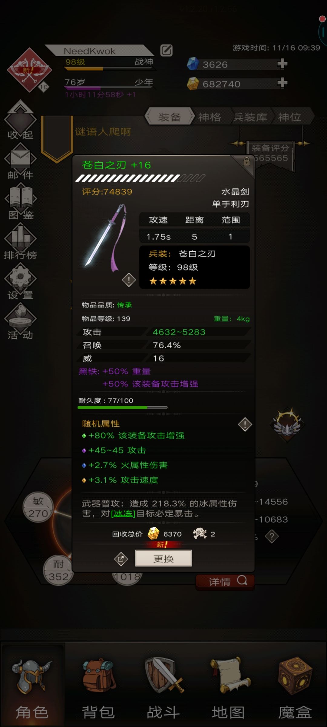 (3)主手还是+16的120级的装备,我现在已经重新强化了一个17的140装备,但是一直没刷到黑铁