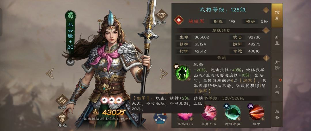 核心增益【励军】:战斗开始时,全体我军直接获得6层【励军】,相当于常驻12%的攻击和精神加成。更关键的是,任何我军武将行动结束后,马云禄都能再获得1层【励军】,最多可叠20层(即40%加成)。这个增益永久存在且无法被驱散,让她在持久战中作用巨大。