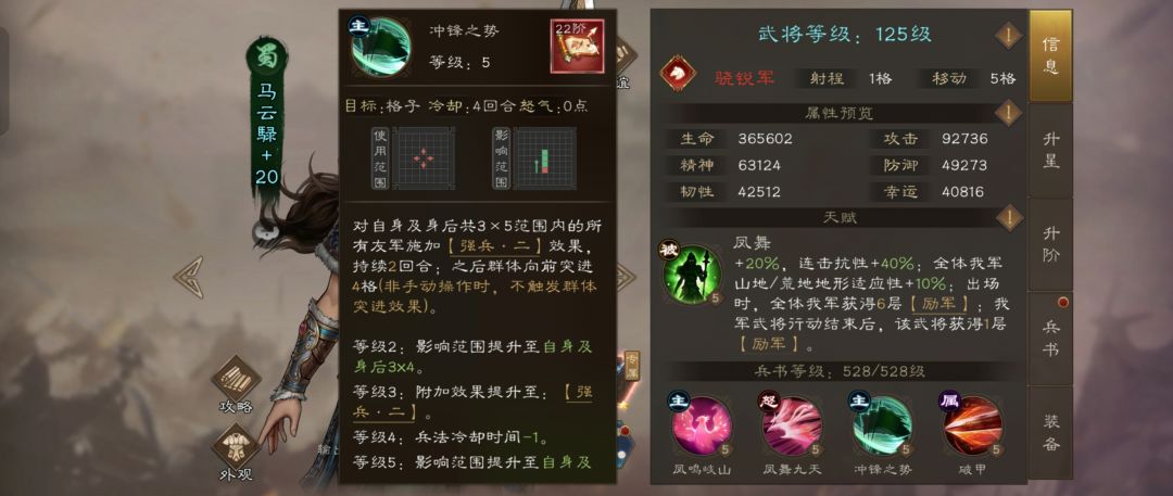 冲锋之势(主):这是团队群体位移的核心。她能给自身及身后3x5范围的友军施加2回合的【强兵·二】(兵刃、谋略伤害+30%),随后带着范围内全体友军向前突进4格。这一技能无论是追击还是调整站位都极具战略价值,冷却同样只有3回合。