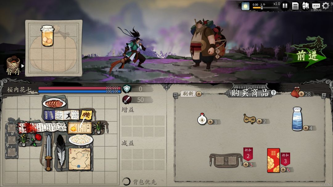 游戏的这个大地图做的就很肉鸽啦,首先目标十分清晰,就是最中间的那个华山之巅,其次每一个的格子你也能看到其他玩家走到哪里了,NPC分布如何,宝箱以及商店都在哪,甚至还有许多奇遇的分布,所以我建议咱们一开局就可以规划好一个大致的行进轨迹,值得注意的是,本作的匹配机制采用的异步,也就是说你只需要玩好你自己的就行了,即便是与其他玩家相遇了,也不是同步的,这就减轻了我不少的心理负担,老老实实发育,最后共聚山顶再一决雌雄。
