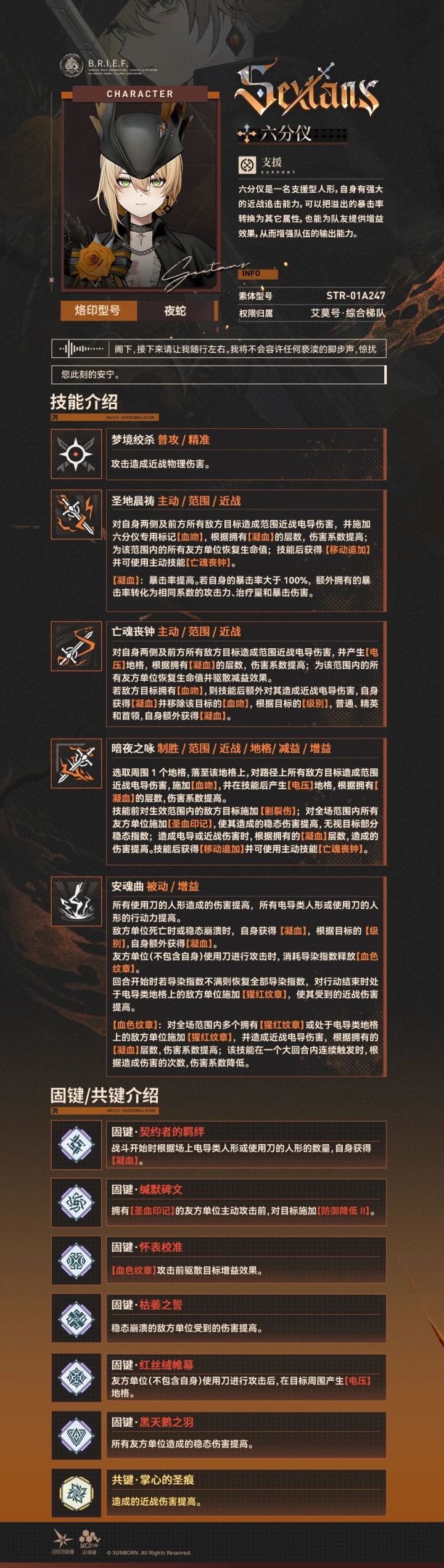 六分仪在游戏中定位为支援型人形,自身拥有强劲的近战追击能力。