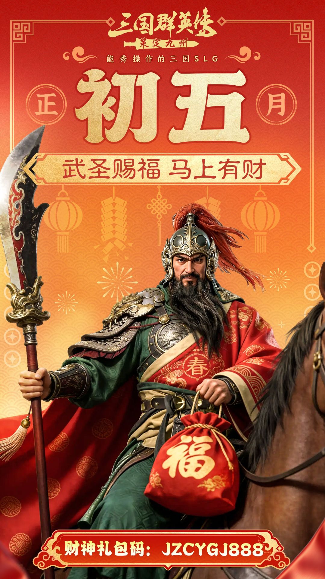 赤兔马日行千里,福利到账不延迟!海报里关二爷手中的锦囊,早已为各位主公装满了开荒拓土的硬通货!今日,只要输入财神专属礼包码【JZCYGJ888】,即可解锁武财神专属福袋!