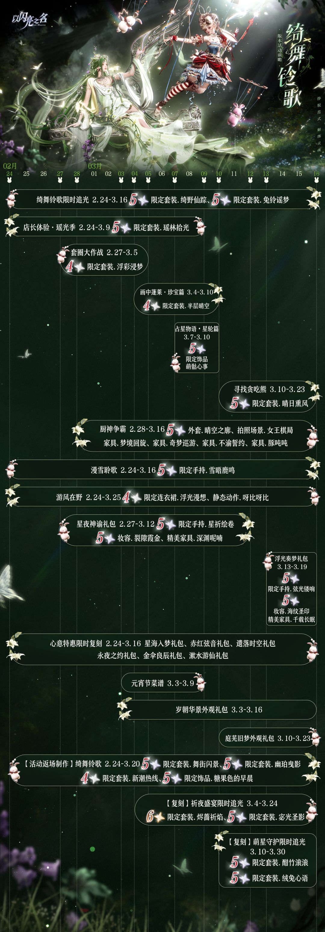 2月24日10:00,限定追光活动【绮舞铃歌】上线!全新五星套装及SR羁绊限时登场!该追光活动每登场10次内必获得SR羁绊或限定五星套装部件(直至集齐所有限定五星套装)。集齐限定五星套装·绮野仙踪可激活专属出场动作【蔓引铃音】,集齐限定五星套装·兔铃谣梦可激活专属出场动作【兔偶奇缘】,并可在拍照-动态动作里使用。