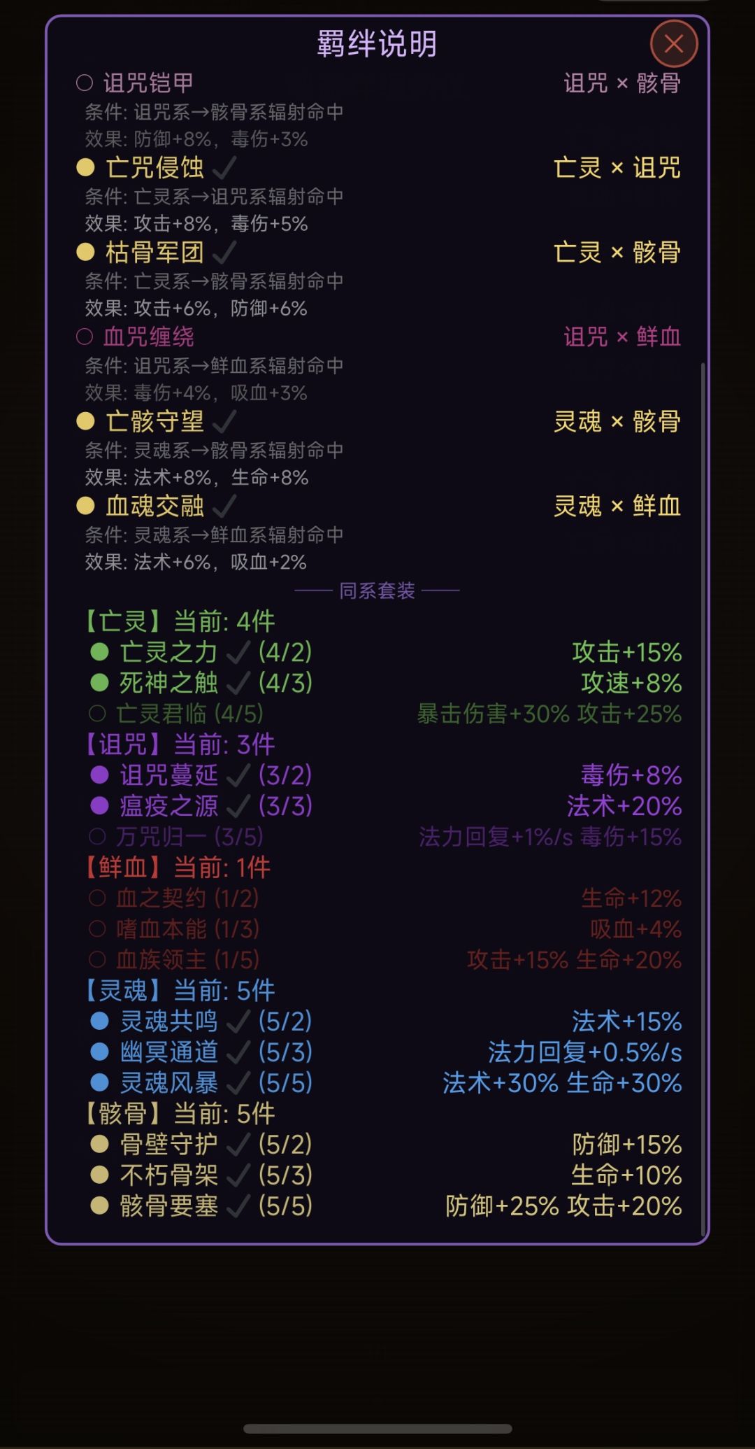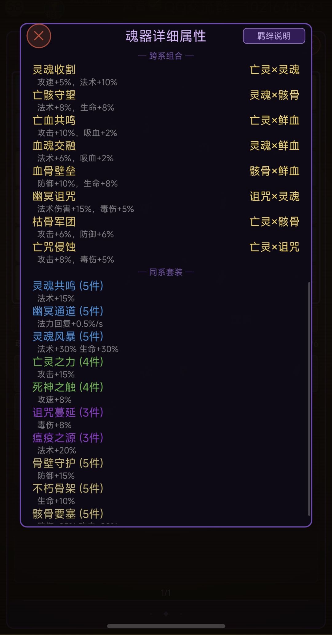 魂器系统解说:小怪和boss随机掉落魂器,可自由组合排列魂器,一共分为5系魂器,如果魂器星点处存在可加成系列魂器,那么会产生魂引效果。同系魂器达到一定数量会激活对应的魂器羁绊,不同系魂器也会激活跨系羁绊。