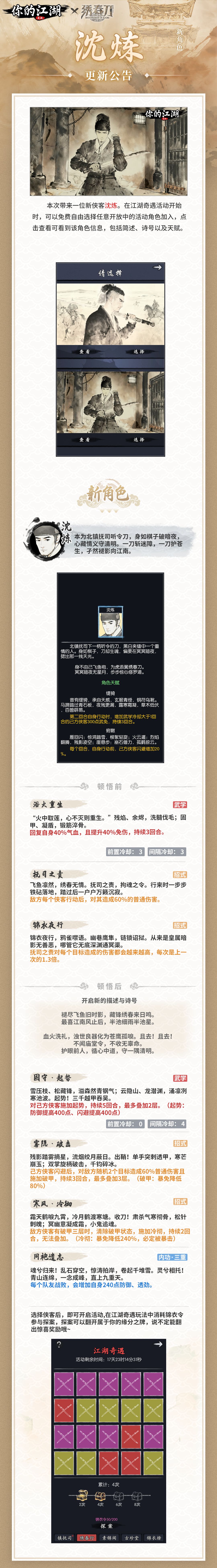 近期新踏入【你的江湖】的少侠们,本次活动可以在<沈炼>和<丁修>中任选一位免费加入喔,希望这两位独具特色的新伙伴给大家带来不同的战斗体验~