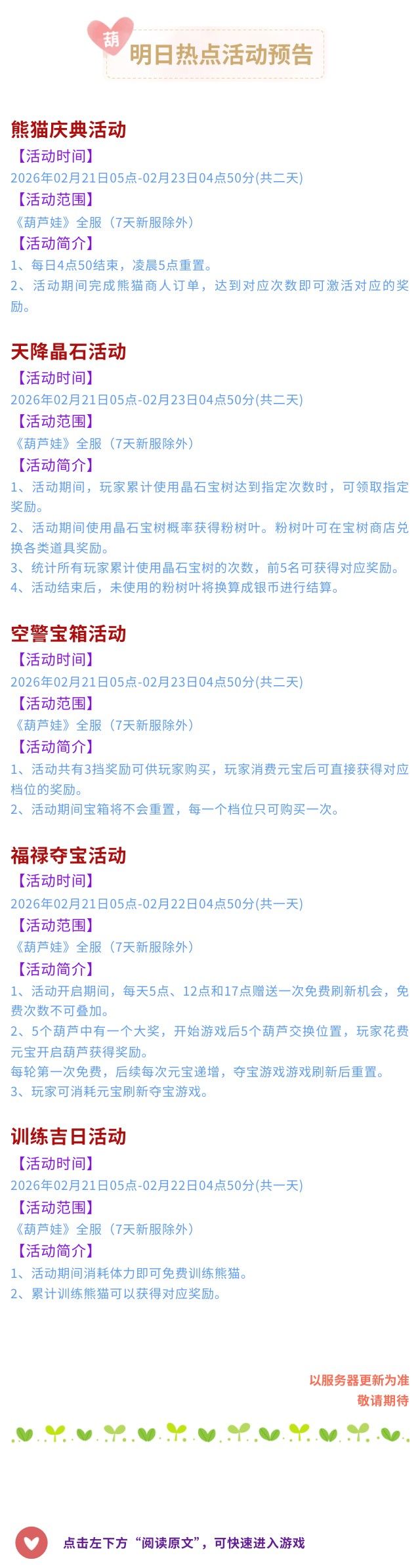 【葫芦娃】2月21日活动预告