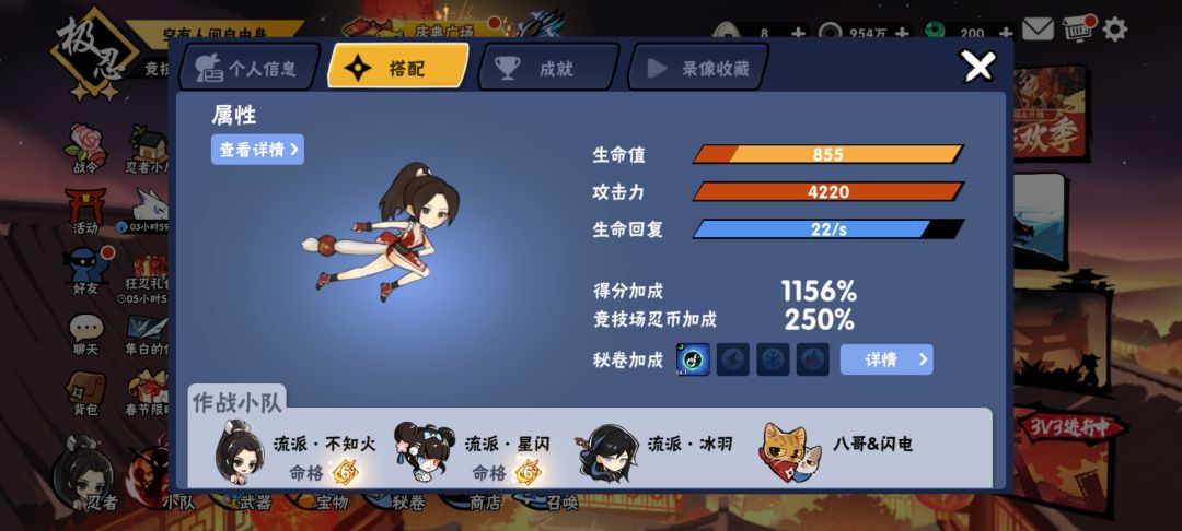 哈哈玩了这么久的忍三,我终于通过了自己的修炼把不知火舞全部拉满了,因为是偏收藏嘛所以宝物就弄了一勾。我感觉有我这样的毅力做什么事都会成功的。也用箫炎那句话来纪念一下吧。