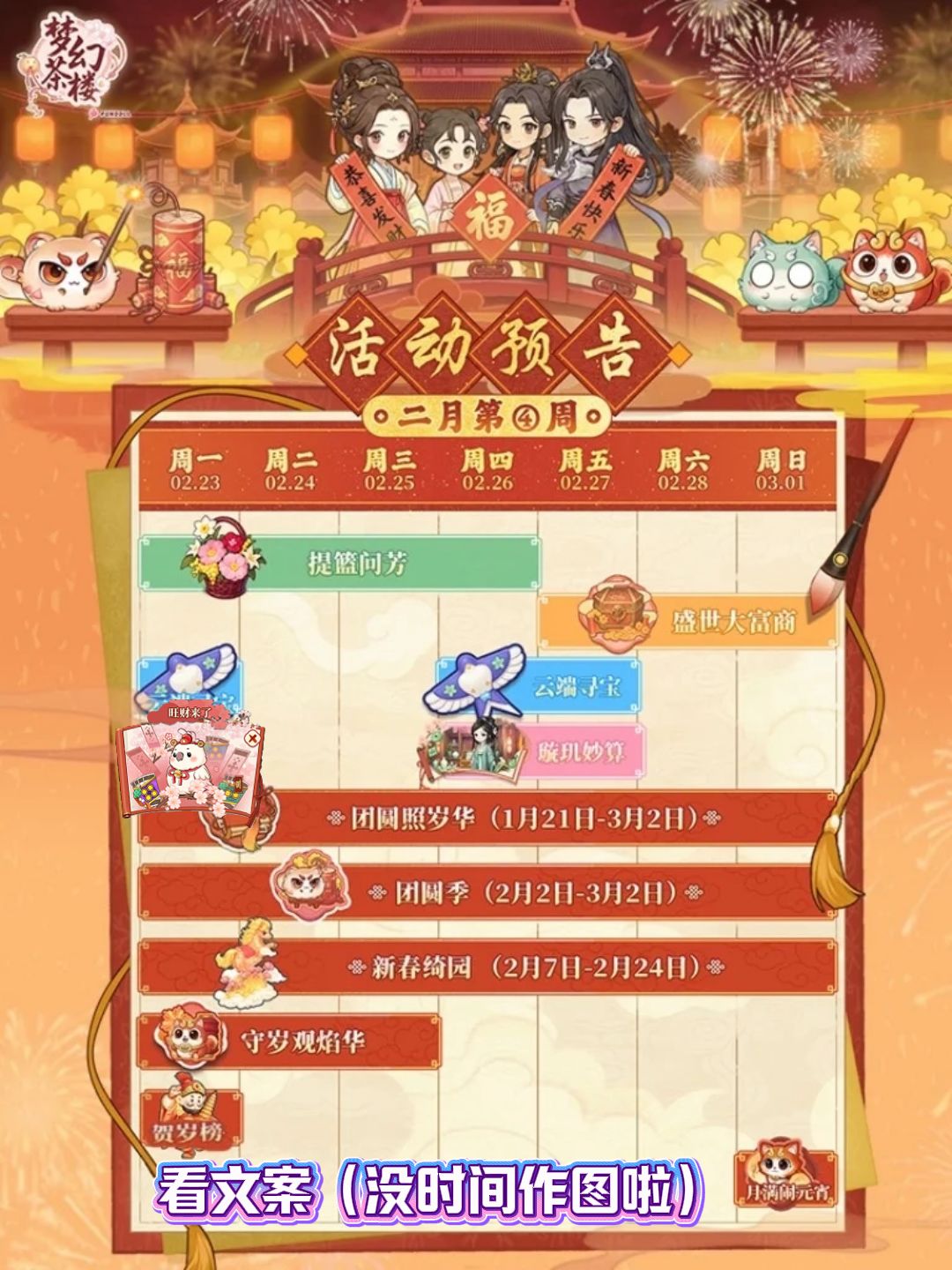 6.团圆照岁华,戏符活动。本轮开放无限套合成,目前进度快的宝子已经在集第四套戏符啦!搭配幸运签活动,多多益善!过年期间抽签时间从早上8点调整到中午12点,建议早几分钟进游戏,12点才进可能当天名额就抽完了(什么时候轮到主包也能中个签)