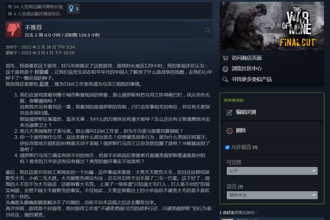 这就不得不把目光转向我在steam上唯一打过的一次差评上了。这是给我很喜欢的一个游戏《This war of mine》打的差评,差评的原因同样出在游戏之外的事上。当时俄乌冲突刚刚爆发,11bit谴责了大毛的侵略,宣布会将接下来一周的收入都捐给二毛的受害者。彼时的我对国际局势的认识比现在还浅薄,天真地认为游戏理应抽离于政治之外。那么既然11bit竟然主动涉足政治议题,就别怪我这个“理中客”义愤填膺地写差评了。