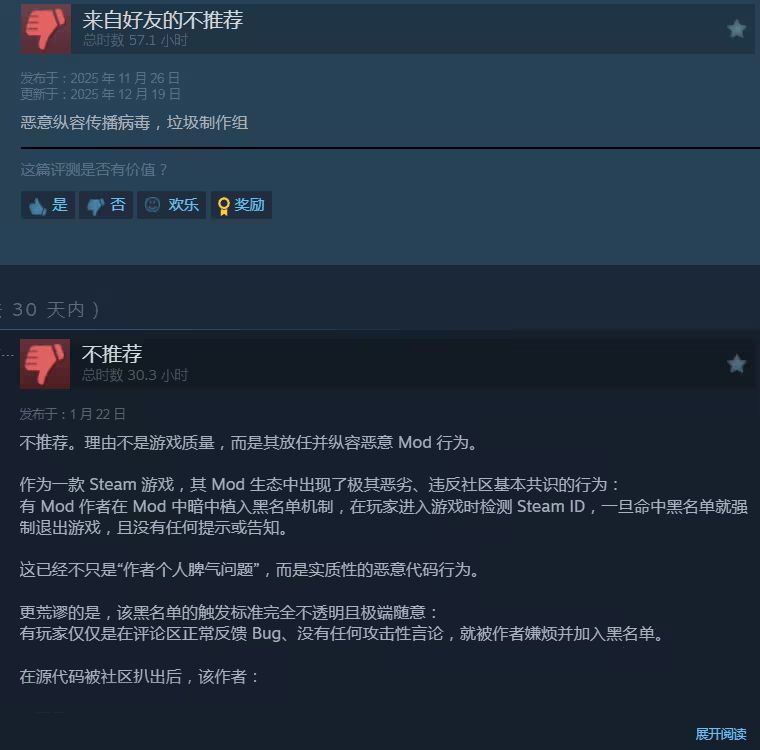 随后的一个月里,鸭科夫收到了铺天盖地的差评,尽管官方随后跟进,封禁了该作者,下架了他的所有MOD,但为时已晚,覆水难收。