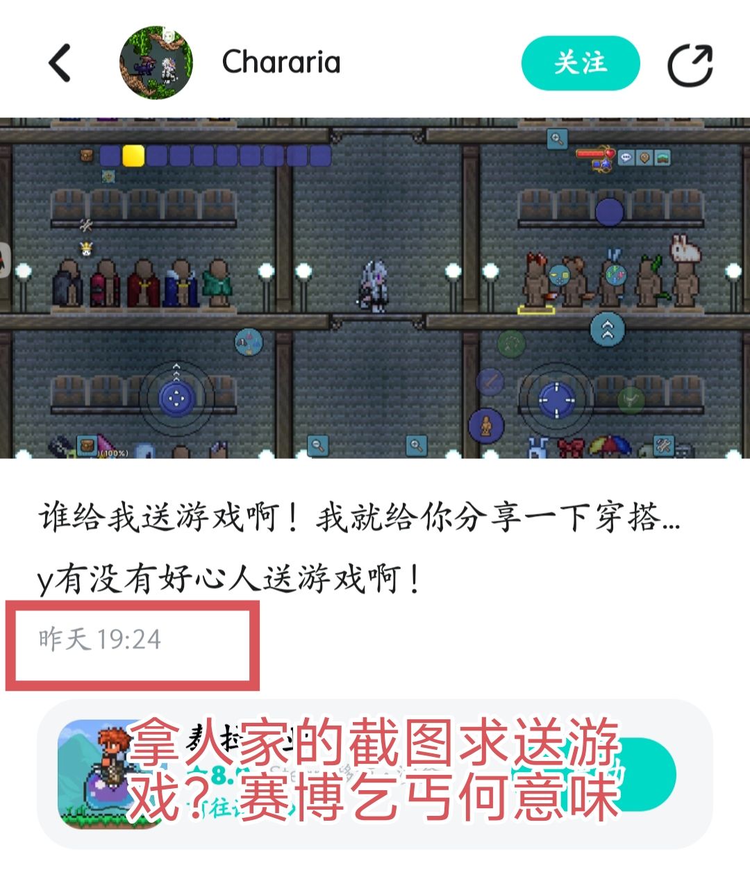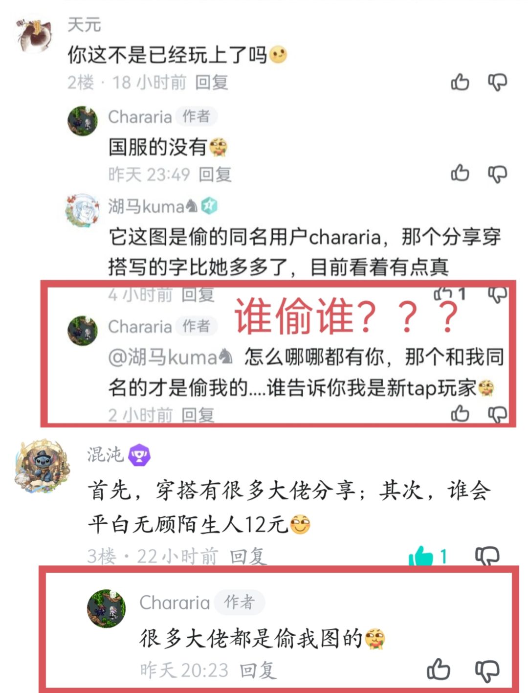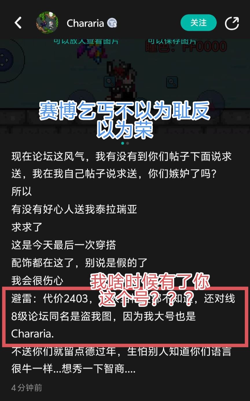 此人Tap原名“婷婷玉立”,搬运他人的时装搭配并发布帖子自称原创,看流量起来后直接复制我的名字在论坛里发布乞讨信息,要求别人送其泰拉瑞亚国服游戏(现大量乞讨帖子已被删)
