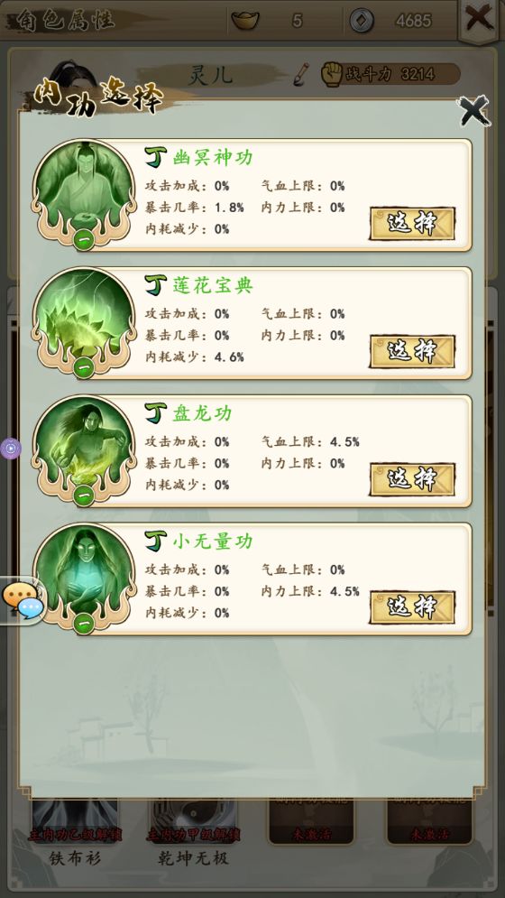 目前游戏共有5种基础内功供少侠选择,分别是: