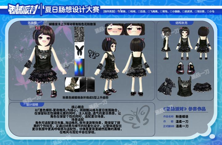 【设计灵感】:以「墨色蝶影·夏夜晚风」为核心,将甜酷风格与夏日氛围融合,在保留标志性蝴蝶元素的同时,注入轻盈、透气的夏日质感,让角色在保留个性的同时,适配夏日场景。
