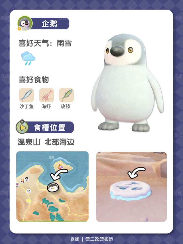 冰雪季限定动物企鹅 食槽位置 喜好食物天气 解锁:做完冰雪季第四周活动任务-重大发现 离开:3月14日早5点59分 新玩法:生活碎片功能 升级到4级,解锁生活碎片功能 企鹅离开后,不定时刷新生活碎片