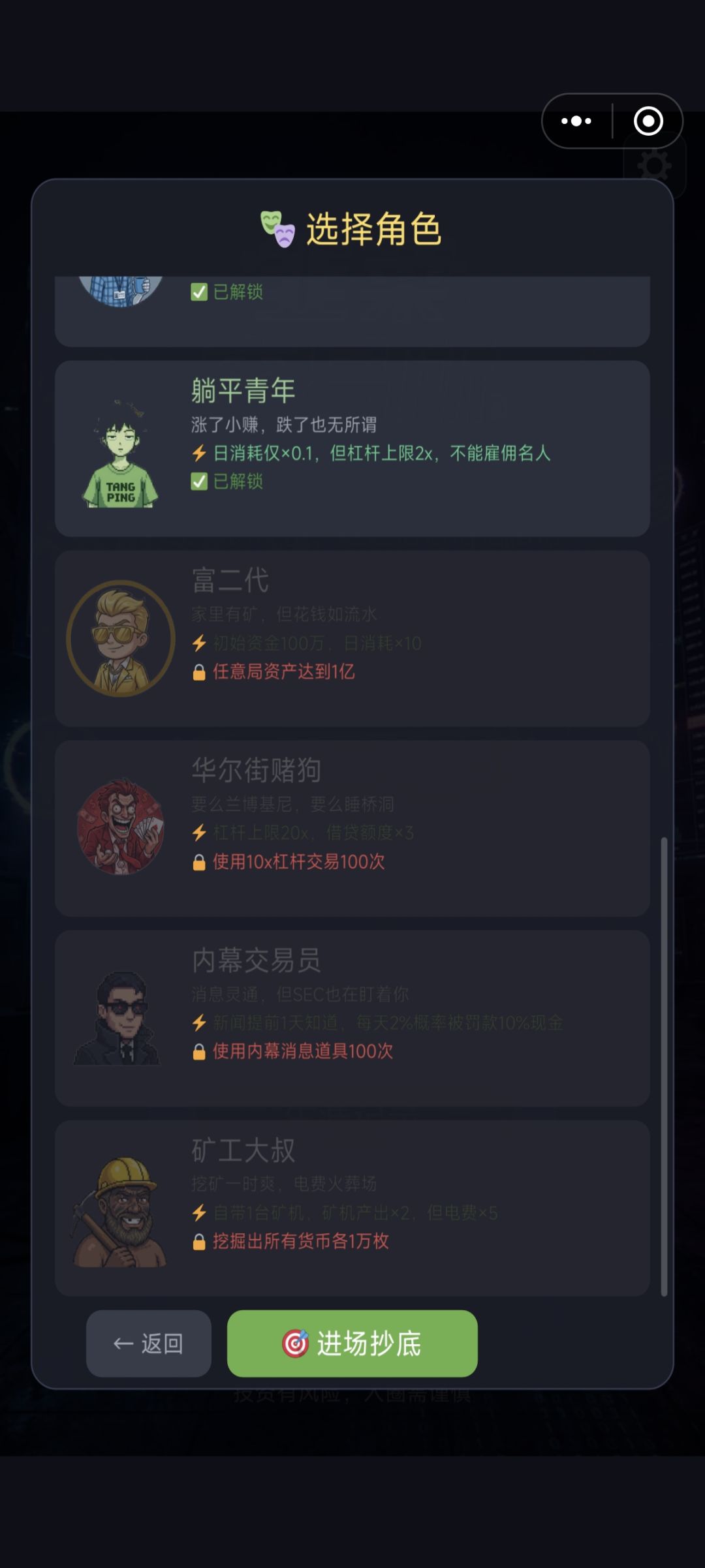 ①游戏机制问题:炒作有点太超标了......基本上就是无脑滚雪球思维,固定套路开局攒到3w然后自己发行新币,剩余的钱全部放到合约里面直接选杠杆100倍,接下来去贷款5w全部用来炒作,6个炒作手段下来极大概率是赚的,然后回到合约直接平仓,然后钱就一直放着别动(买啥币都赚不了多少,不如集中炒作一波香);之后每32个回合或者64个回合,就把所有资产全部放到合约里面选杠杆100倍,然后去贷款5w一次性用在所有可使用的的炒作手段上(要么有4个可以用,要么有6个可以用,风险对冲后极大概率还是可以整体赚),然后炒作完就返回到合约里面平仓,只要重复这个操作两三次,你一人财富就相当于世界总gdp了![[表情_微笑]](https://img-tc.tapimg.com/market/images/0f170d4b1ecf80c267e5a44b5992a199.png)