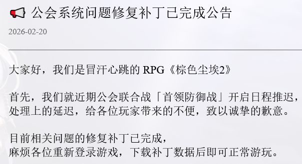 公司开发,特色为颜色因素的角色扮演游戏《棕色尘埃2》之前不是宣布公会战推迟然后卡审核被迫跳票嘛,现在官方总算是解决了这些问题,补丁也终于打完了,玩家重新登录下载数据就能正常玩了。