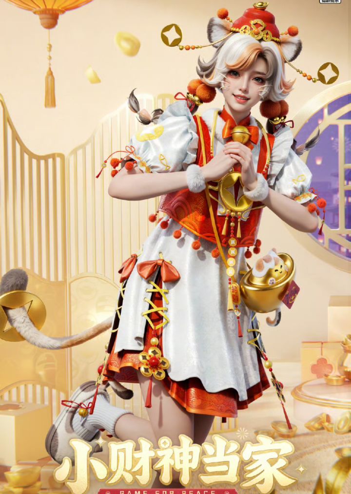 2月21日,《和平精英》新春主题小财神当家系列外观正式上线,限时财宝币抽取与碎片兑换活动同步开启,活动持续至3月6日。该系列以新春迎财神为主题,采用喜庆新中式风格设计,推出男女款特色套装,以及M416、破片手榴弹、平底锅等主题道具外观,整体融入金元宝、招财、富贵等年味元素,氛围感拉满,契合春节穿搭需求。