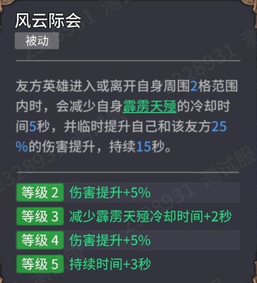 回怒&增伤:每次击败敌人可回怒、提升霹雳天極范围,可提升输出效率;友方进入、离开自身2格时可降低霹雳天極冷却,提供15秒伤害提升效果。“撤退、上阵、战术大师的位移”均可触发此增伤效果,除了打伤害外,雳光还有输出增益机制。
