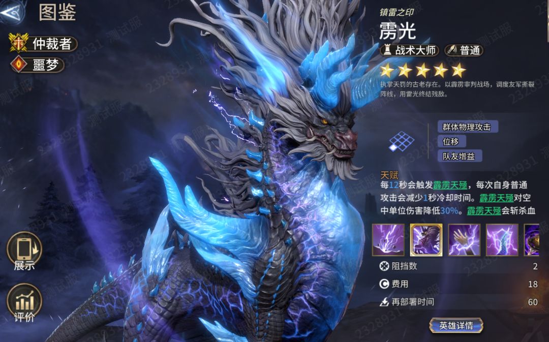 雳光与关羽生态位相当,都能打对群物理输出,但爆发上限不如关羽,属于较好用的对群物理英雄。作为战术大师,雳光可灵活调整身位,也有“再部署”机制,是宝石本的特化英雄。雳光建模、视效都非常棒,再加上这是一个领主自选卡池,整体性价比是较高的。