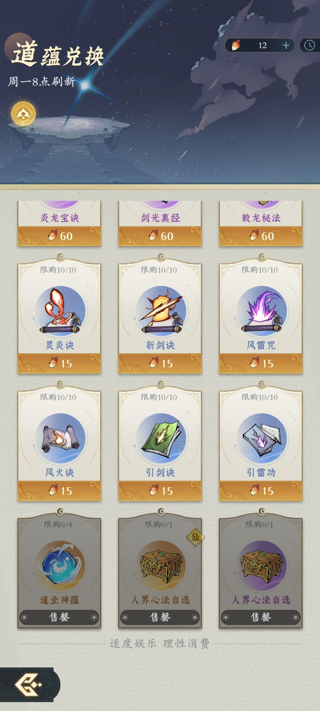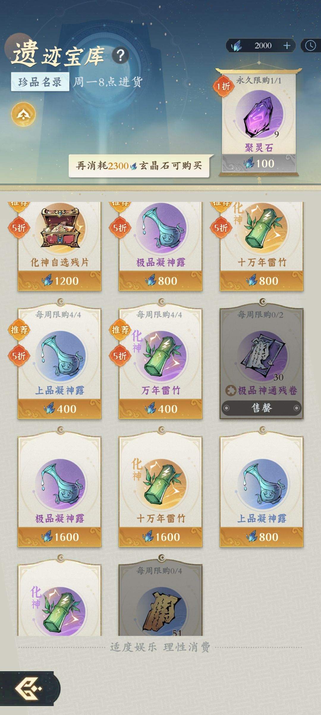 换了所需要的神通就行,贡献很缺!宗能主系推养词条要记得买,每次突破大境界需要购买图纸!需要预留一点!储物戒金丹的不用买,浪费贡献,攻击图纸不要扇子!说到宝库了,神通狗粮必换,其他看你需求。观星崖就这三个其他不推荐购买!你要记得你是0氪!只能优先!再好东西,你买不起!落的四不像,打谁都打不过,心法优先神威融灵!留2万这样心法感悟,其他的点三个地金甲,地长生!后面飞升了,再退金甲,长生!每周免费3次退,免费神通转换一次!