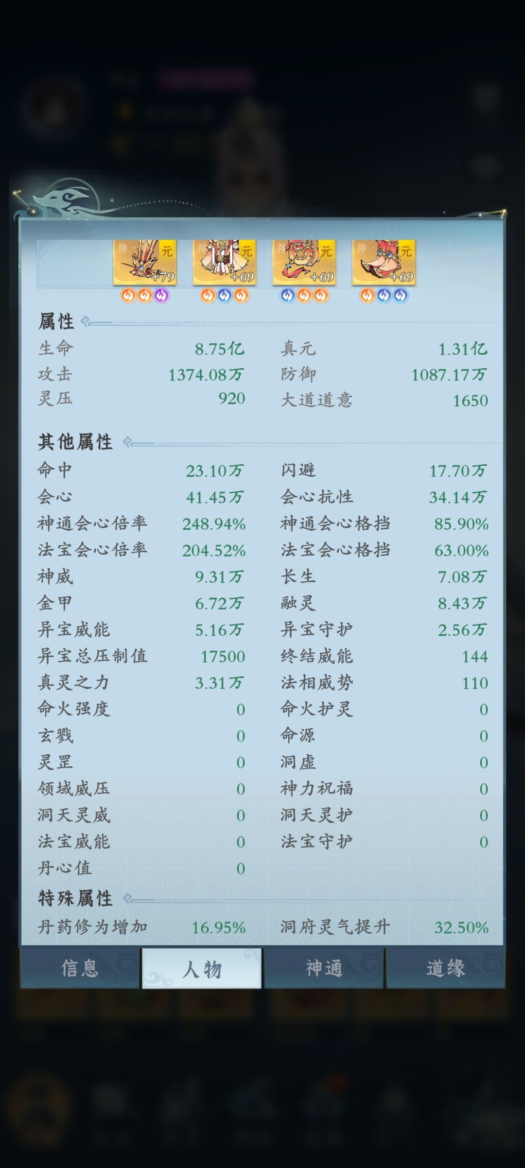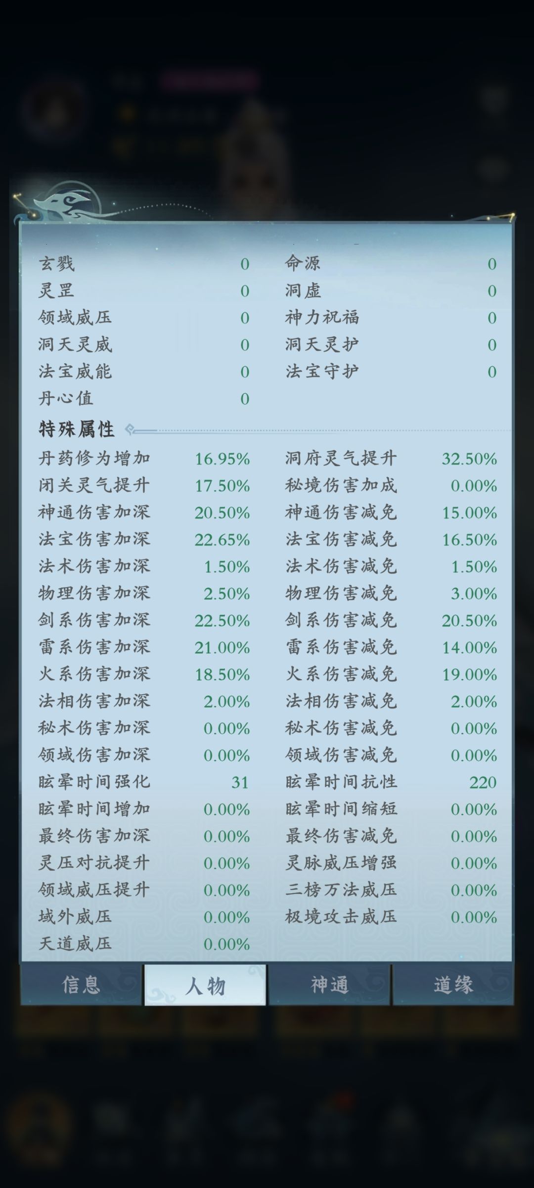 飞升还有14天,第一次玩,看了大量攻略,自己综合的,理论来说飞升神通会心250%,神通加伤20%剑系24%保守估计!掠影已经天一,后续慢慢补,心法推养不能回退,所以看你需要的词条推养,不想要的词条别推了,留着,其他的推二加30精法点就行,就着飞升用!抽的不太好,目前玩存宗门贡献个论剑币了,诸天还有一万么用,杂七杂八的,我是放弃了很多资源故意降低自己资源获取!资源我是主养的二维,攻击,会心就么了,灵压,灵兽,领域全放弃了,资源倾斜0氪极限二维,神通加伤,会心倍数,主系加成