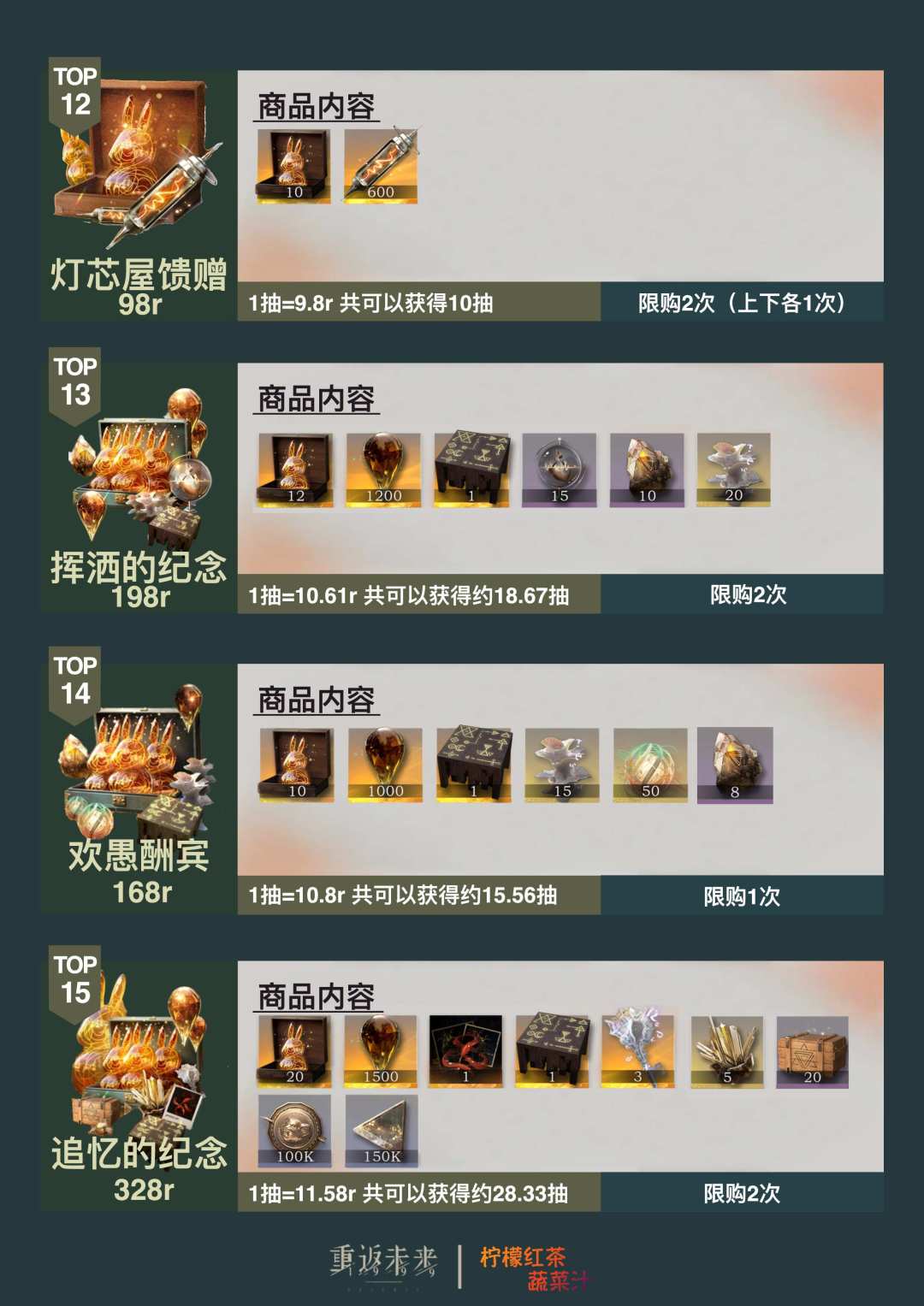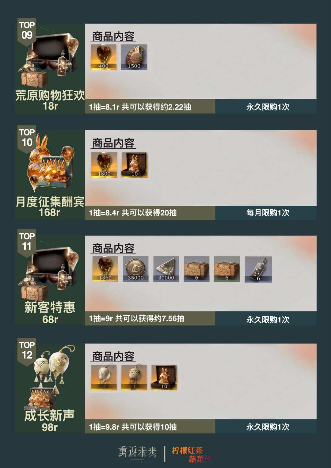 这个笔记展示了3.5新春版本「雨滴」&「金兔子」礼包性价比排行榜