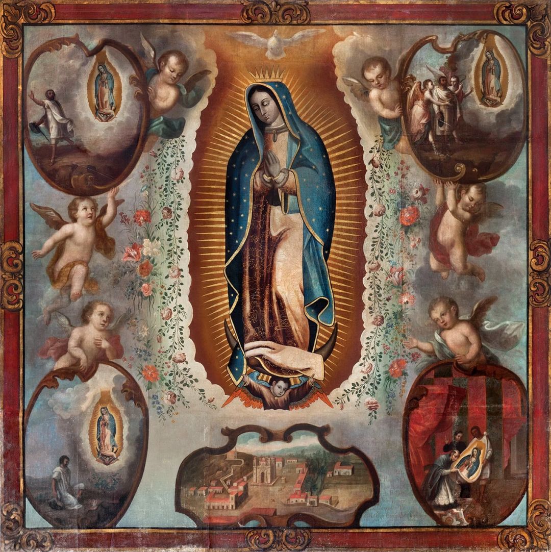 很鬼气的圣母装扮,蓝色的衣袍应该是参考了墨西哥独特的瓜达卢佩圣母形象,不过因为钴蓝色自古以来都是油画中很贵的颜色,所以也常用在圣母肖像上,成为圣母形象的标志之一了。同时墨西哥还有圣穆尔特圣神圣母(Santa Muerte),她是象征死亡的圣母。