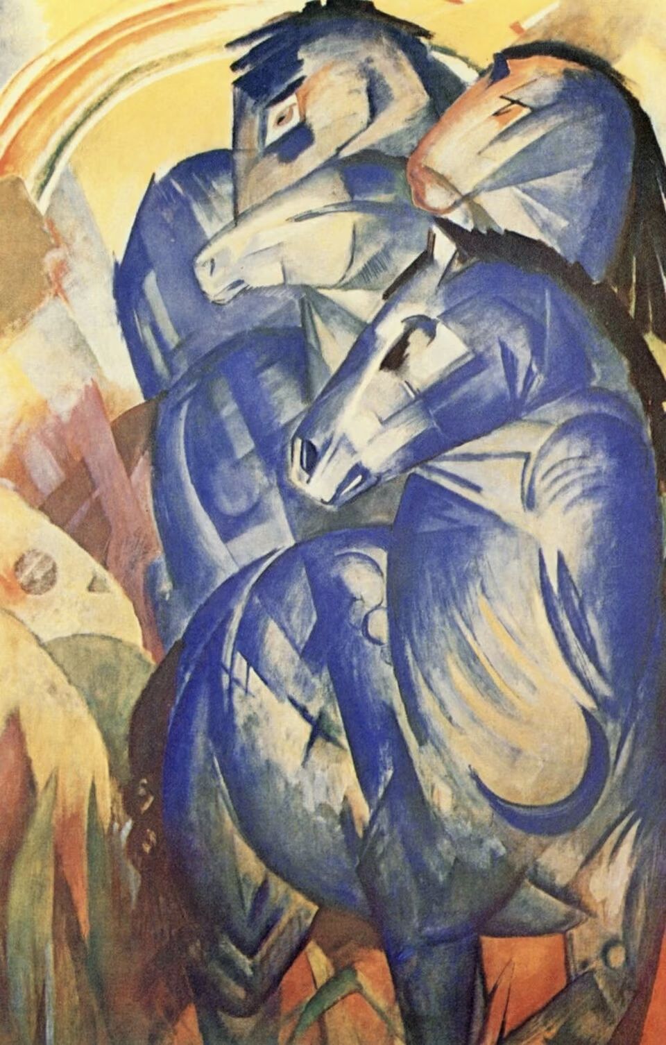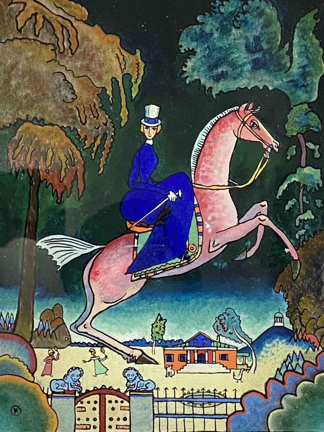 好可爱的裙装!主题是visions of blue,我最初猜视觉主要还是应该是参考了表现主义的画作——弗朗茨的《蓝马》。但是经提醒之后,应该主要参考了俄国画家康定斯基的玻璃反面油画《女骑士与蓝狮子》~