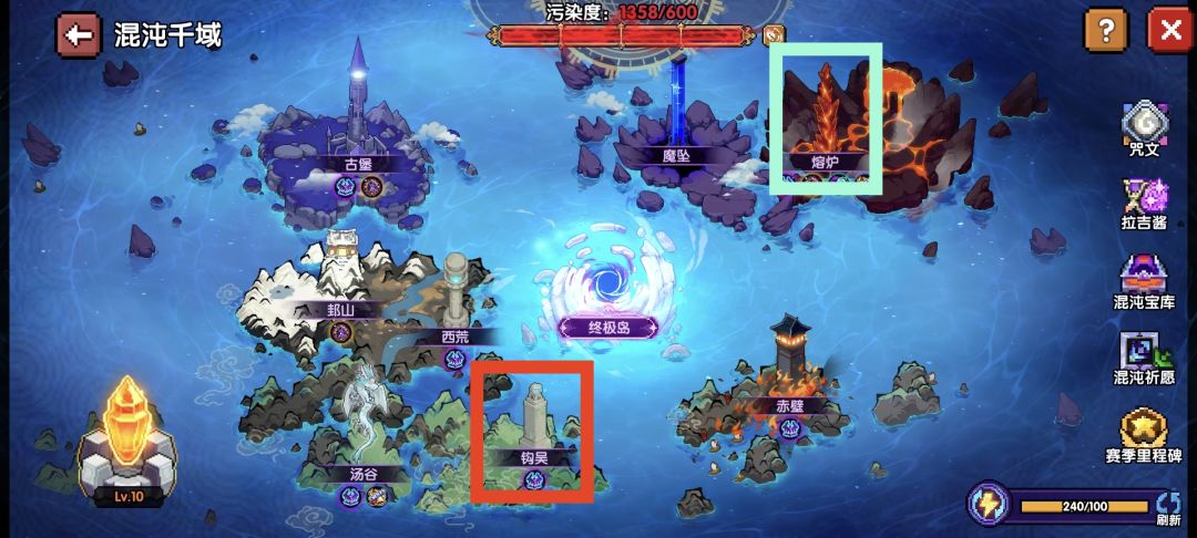 个人首推“钩吴”(见红框),其次“熔炉”(见蓝框)。钩吴的boss较多弹幕都可以被“焚舞行风”清除,大多只需要前后走位去配合焚舞行风都可以稳定不暴毙,且boss不会乱跑