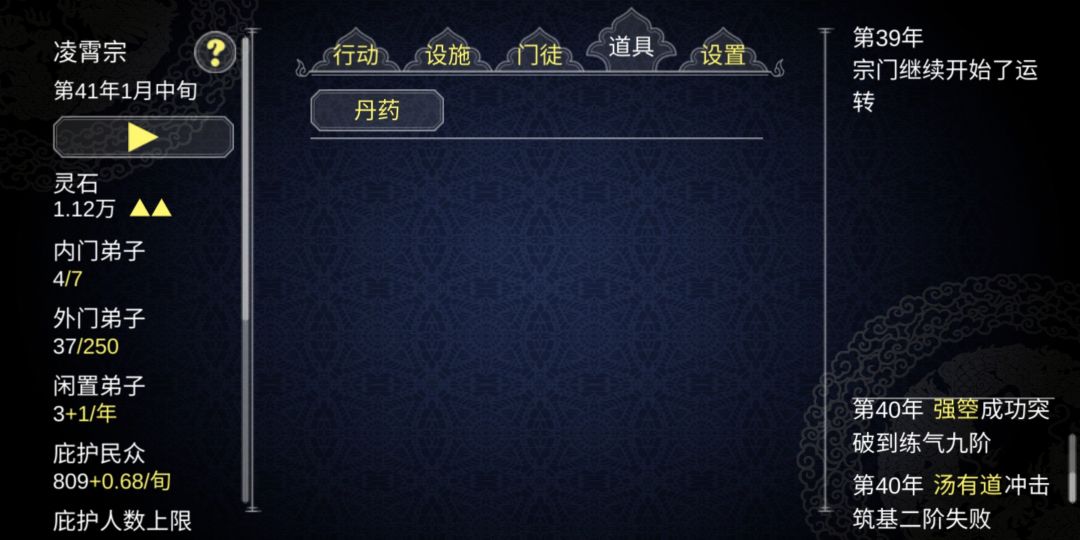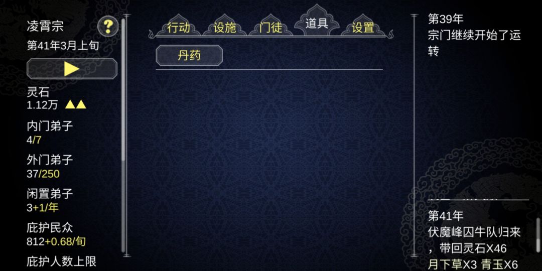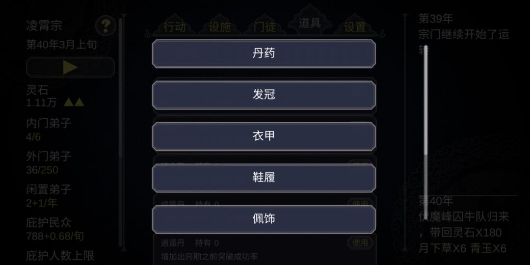 道具栏除了丹药和商店正常显示,装备栏选项有时候会显示装备,但左上角第二行只显示丹药,并且不会有装备阶级选项,也无法售卖。大多数时候装备栏是什么都不显示的。