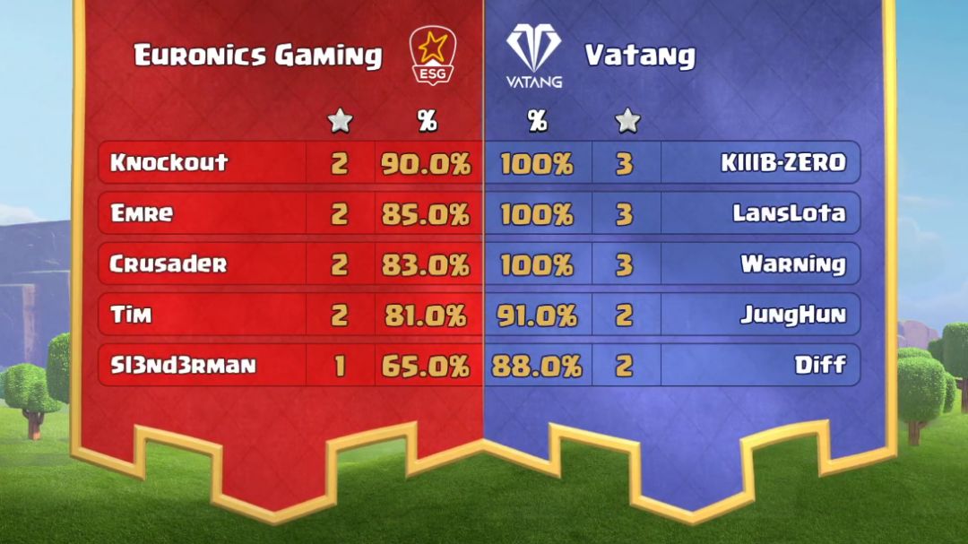 7月晋级赛,Vatang登场的战绩并不理想,首战以2.6%平均摧毁率的劣势输给对手跌入败者组。然而,在败者组中的Vatang并未气馁,之后的比赛他们以极其优越的防守表现,让3星成为对手可望而不可即的存在,最终成功闯入决赛。决赛中面对Nova Esports,Vatang在局面落后的情况下猛然发力,以连续3个3星完成翻盘,最终击败Nova Esports,成功拿下当月冠军和总决赛第二张入场券。