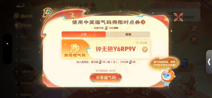 王者荣耀送限时点券【高级福气码钟无艳Y6RP9V】高级福气码,使用可得40限时点券,复制口令传递心愿吧!