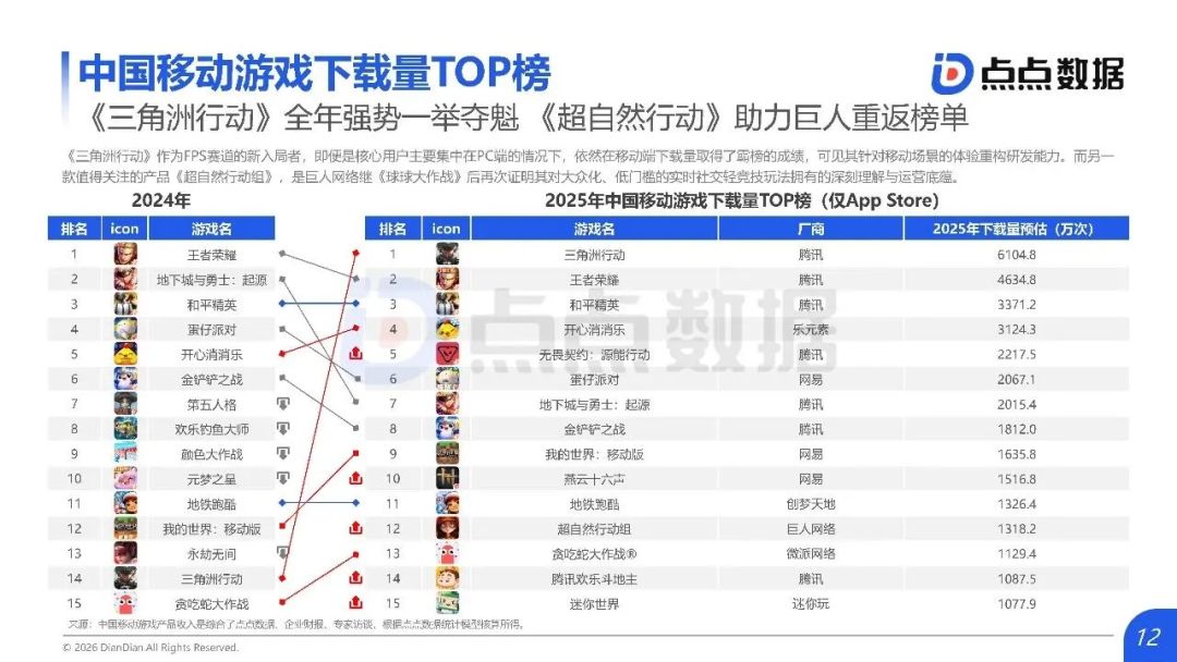 点点数据本次榜单以App Store全量下载行为为统计口径,真实反映年度手游用户下载偏好与产品热度分布。《三角洲行动》的登顶,标志着高品质、强玩法、全球化的中重度手游,依旧是拉动下载增长与用户规模扩张的核心力量。随着2026年游戏持续推出新版本、新玩法与全球化布局深化,其市场表现与用户增长仍值得行业持续关注。