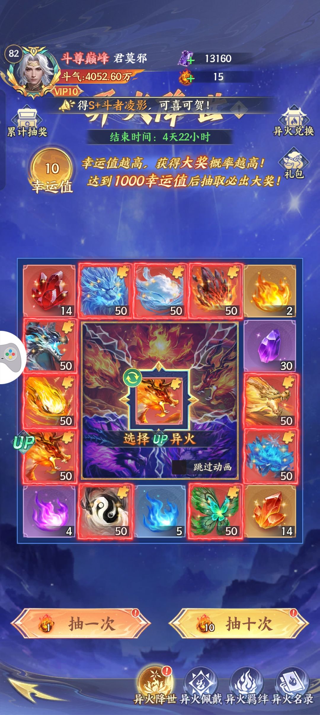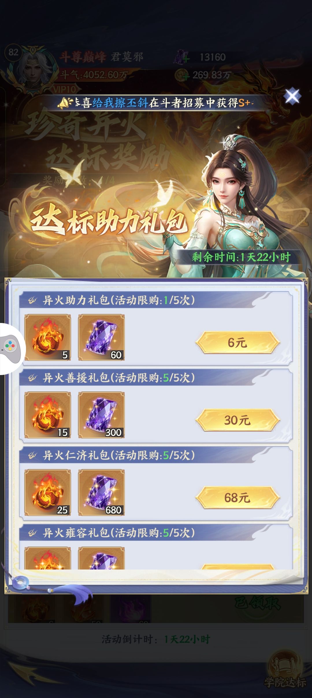 三年沉淀,这个68元一个红异火,低氪玩家其实没必要买,抽一百个异火有概率得四个红异火,我玩游戏运气向来一般,只有三个,还差6个碎片合成一个异火。学院试炼里面抽异火还送种子,而且送的不少,我就买了4个6块,20抽,就到100了,现在还多15个种子,攒着以后再抽