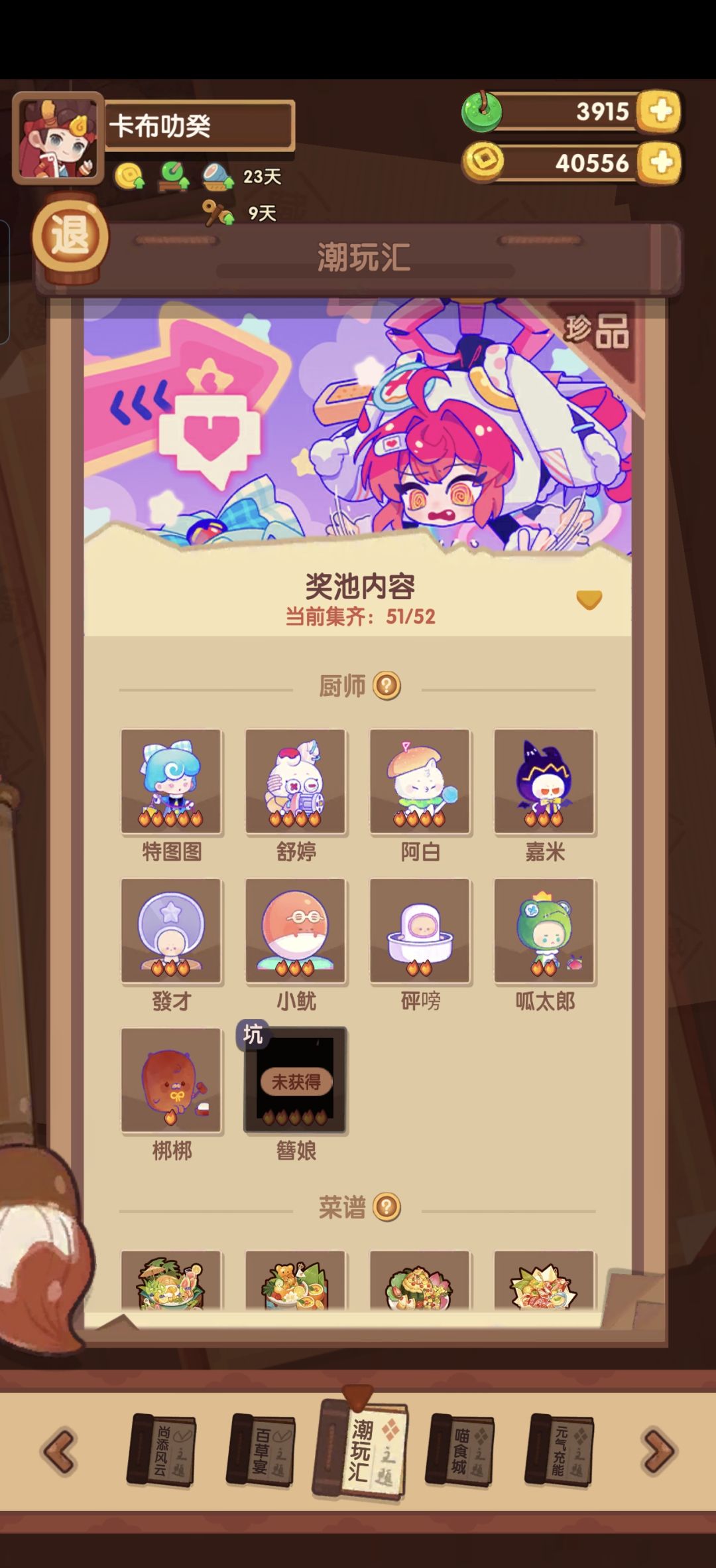 如题,回归7天,送的30券已经+38元买了巧克力礼盒了,但是一点像样的贵客厨都没有(轮椅里面查询的有混沌子,孑子推,羽十六,堂雪这些)。我的规划是先凑齐一队贵客厨,再追求宴会满档。这个厨具是先给谁用着,还是先留着。