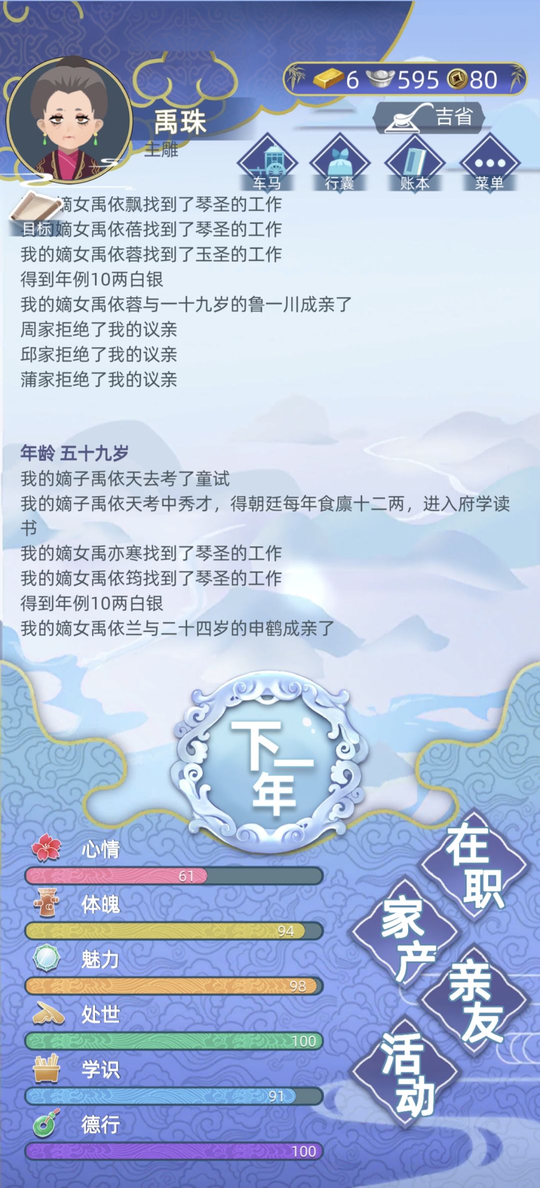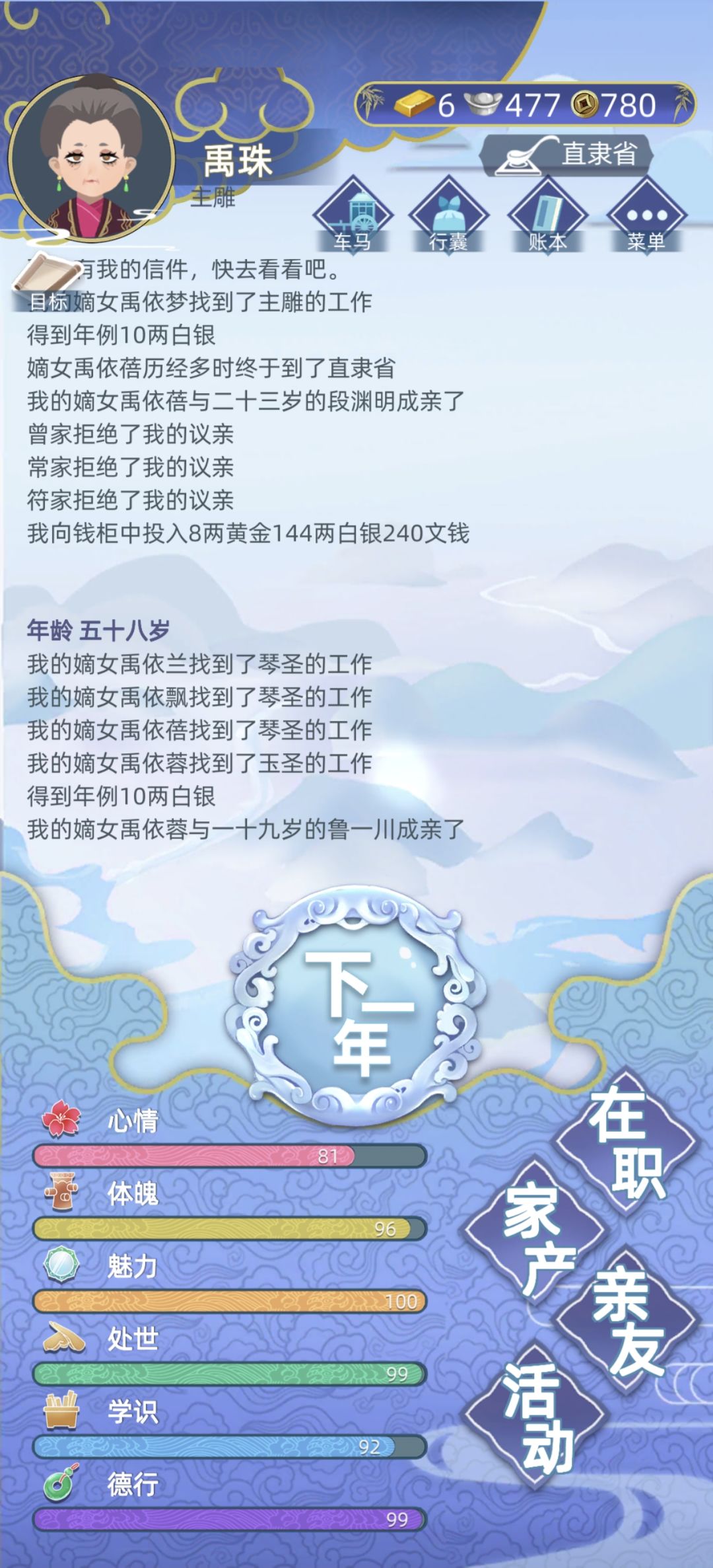 我叫禹珠,字静环,生于吉省通山府,家境殷实,为家中独女,母亲名为郑羽珊,家中排行老三,从小在家修习,因精通玉器,成为主雕,外公曾高中状元,任吉省巡抚,后因贪污入狱,使得家道中落,亲朋好友避而远之,幸得外公在入狱前就已经为母亲选定吉省通州府知府之子,也就是我的父亲禹铭,父亲高大英俊,才高八斗,品性纯良,不为官场所困并且精通音律,成为一代琴圣。父亲对母亲一心一意,尽管爷爷对外公入狱的事情耿耿于怀,想尽办法解除婚约,但是父亲态度坚定,此生只求娶我母亲一人,爷爷也就此作罢。