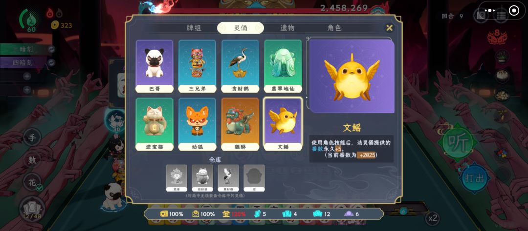 由于筒子乌龟灵俑是削弱对方,这也让碰宝和毒宝一样,可以选择长线战斗来发育,靠着紫色乌龟和绿色乌龟,把对面的倍率/底分削弱成路边一条,同时给貔貅、梼杌、麒麟这种战斗成长的灵俑叠层数,也可以适当保留“贪念”这种小鬼牌,自己一直刷钱,最后做九莲宝灯胡牌(但是要注意,如果对面有分,自己的底分不能被贪念扣到0)