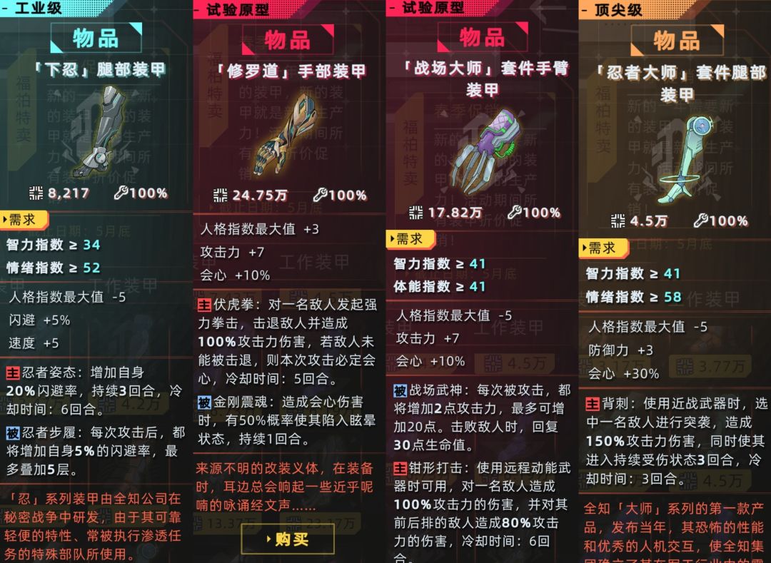 6攻击力10%闪避13速度,主动对目标造成3次70%伤害,附带5穿甲。少有的带闪避的手甲,叠闪避可用,主动伤害较高且无武器限制,装甲不容易被打烂。