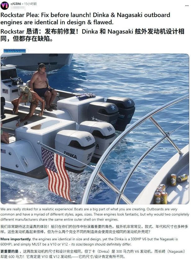 该玩家指出,画面中两艘游轮的发动机分别标注Dinka与Nagasaki两家不同厂商,但外观模型却完全一致,与R星一贯的精细风格不符。不少玩家跟着“较真”,希望官方能在游戏发售前修正这个小疏漏。