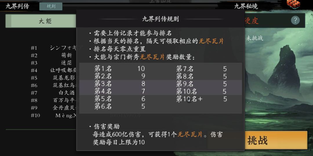 无尽塔特殊排名技巧: 第一天算好时间开始打,等过了0点之后强退游戏重新登陆,继续未完成的挑战,进去之后等一会主动退出,成绩算第二天的。