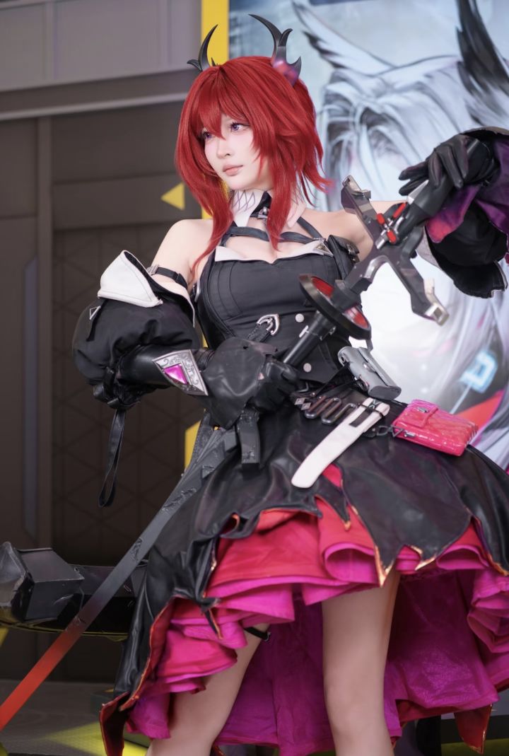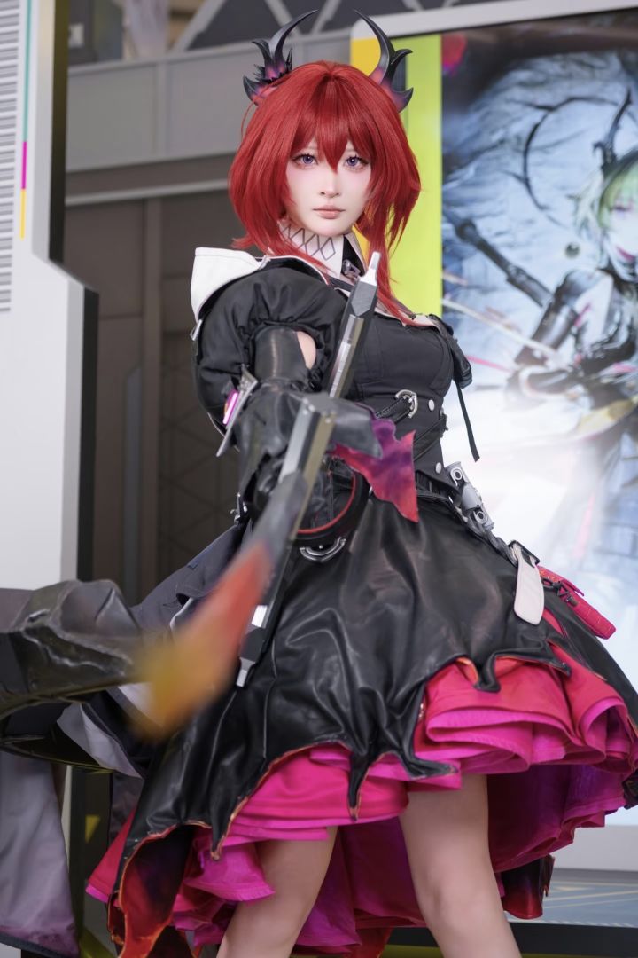 红发如火焰燃烧,双角与利刃彰显着战斗本能,莱万汀的coser将角色的狂傲与坚韧演绎得入木三分。黑红渐变的裙装充满设计感,金属配件与皮质装饰交织出科技与野性的碰撞,手中的长剑更添几分凌厉。她的眼神坚定而决绝,仿佛随时准备投身战场,每一个动作都充满了爆发力,让人感受到角色作为“开拓者”的热血与担当。
