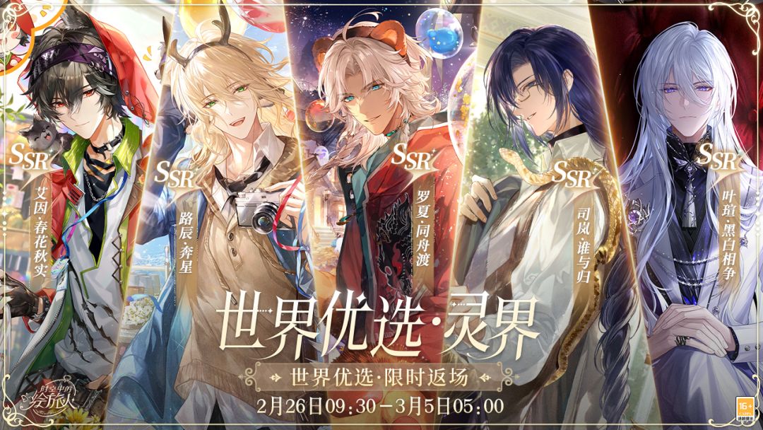 艾因SSR[春花秋实]、路辰SSR[奔星]、罗夏SSR[同舟渡]、司岚SSR[谁与归]、叶瑄SSR[黑白相争]限时开放获取,画廊具备绘制奖励,每名角色绘制奖励互通,绘制次数达160次时可获得对应画廊的概率提升SSR画灵。