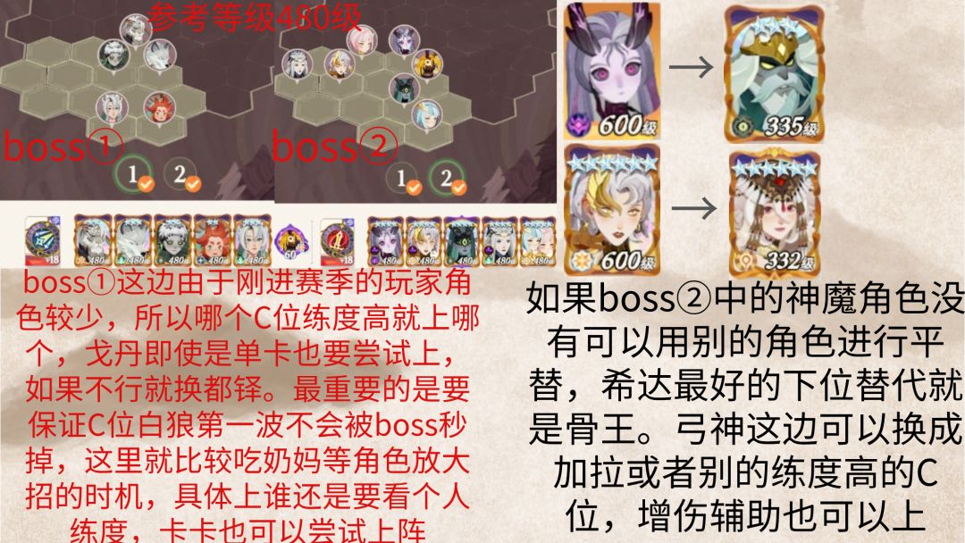 第二个BOSS:新区玩家可能没有希达,骨王就是希达最好的替代,弓神没有的话可以上开专加拉或者开专沙利叶,如果都没有就选择练度高的C位或者辅助。