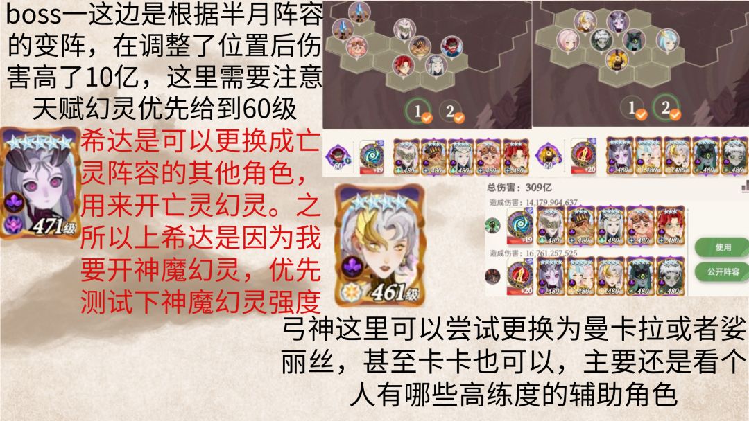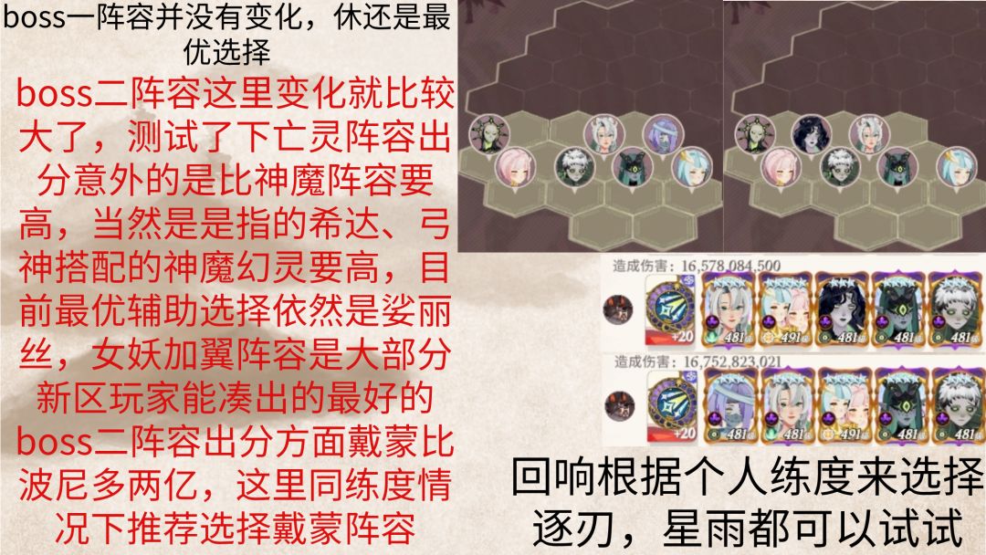 boss一阵容首选出分是休,二阶段首选反而是亡灵队了,由于二阶段所需要的神魔新区大部分人没有所以这里不做推荐