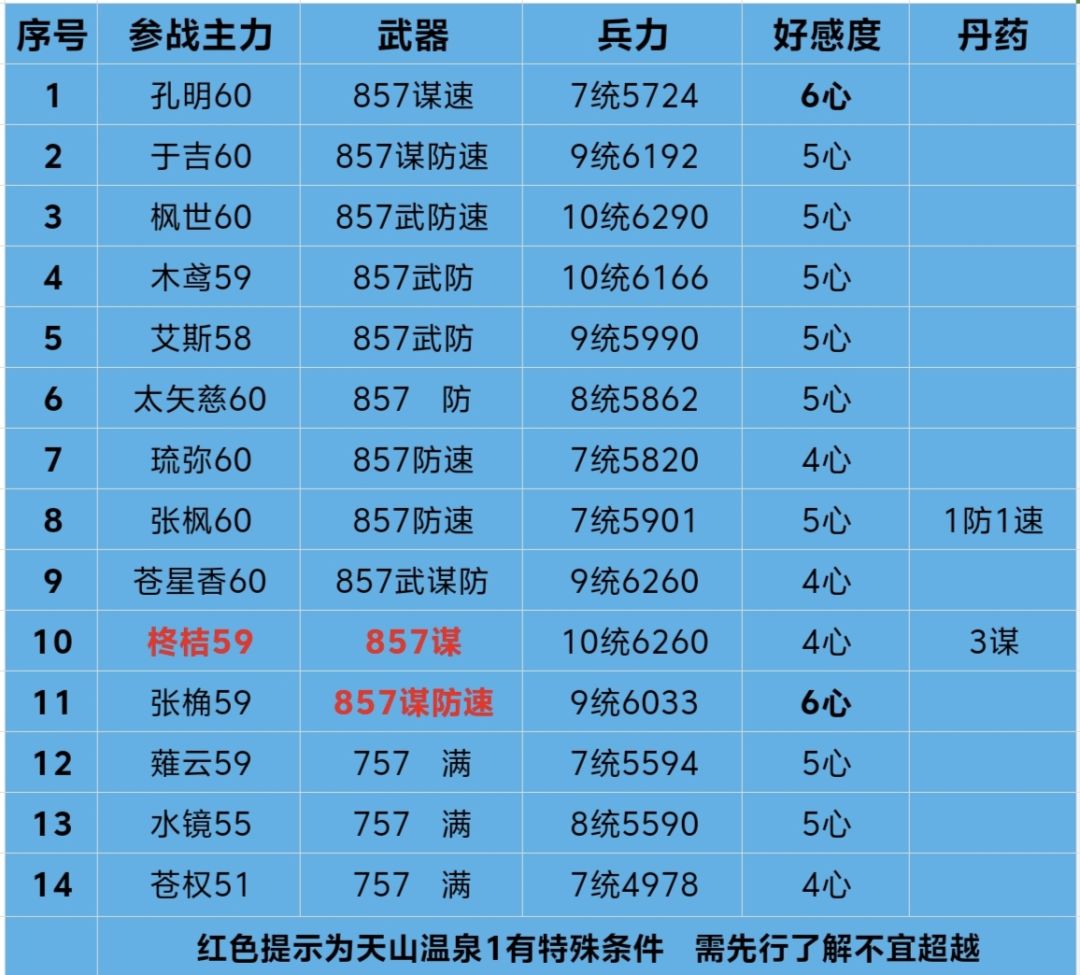 如果声望不多,可以给双弓9级统帅而提高招募,张宝不用给防御丹(失误随手给的),周瑜3谋(不然就得12统)是为了不练孙策而且后期周瑜也有用,温泉1周瑜张桷最好不要超过59级,周瑜不要打速度,不然同样的打法需要给孙尚香1防御丹,张桷1速度丹,那样不如练孙策算了。开启后日谈须过仲达2心剧情战,艾斯单挑至少需要10统,注意艾斯不宜打速度石超过105速!!然后55级打董卓玩点了1级弓箭免伤,平时其影响可以忽略(温泉1张桷若60级并且有8级防御石除外)。