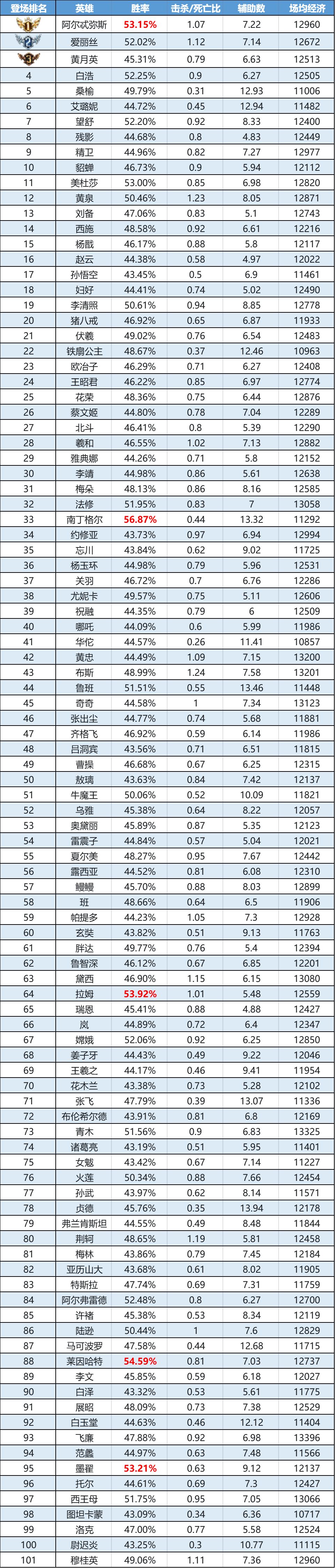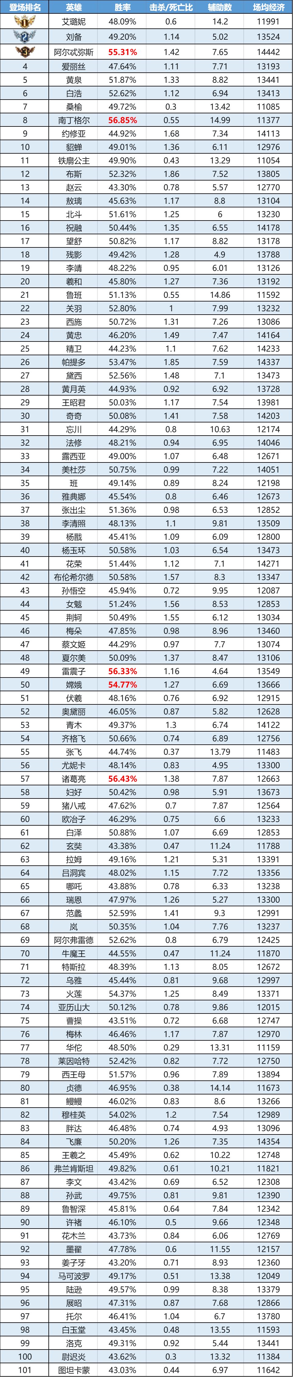 排序:按登场率高低排序,标红为胜率前5