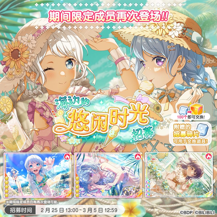 2月25日,游戏内将开启「海边的悠闲时光招募」,2025年1月27日~2月3日开展的「海边的悠闲时光招募」中出现的期间限定成员再度登场!