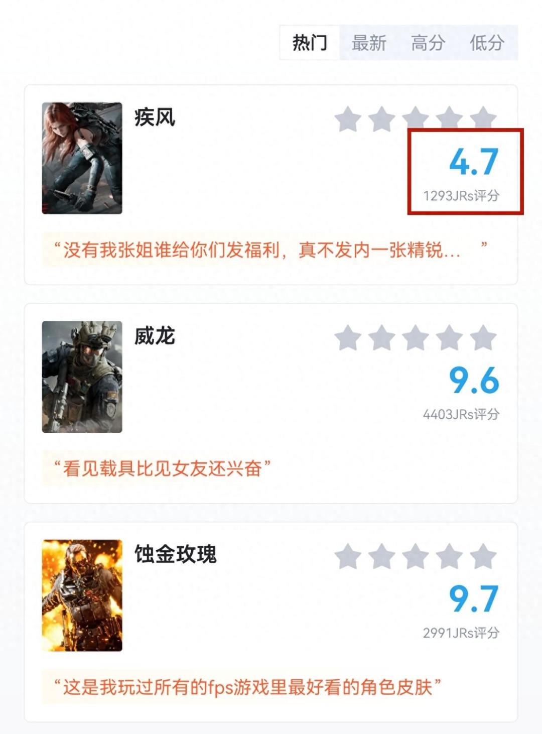 我们可以直接看口碑,威龙评分是9.6分,而红狼的常驻红皮是9.7分,而疾风却少得可怜的4.7分,连威龙一半水平都达不到,要知道,疾风本身的数值并不差,特别是策划把她的绳子从原来50米加到100米后,更是史诗级强化了这个干员,整个三角洲哪个干员不知道疾风的强,可即便面对这样的情况,却连口碑都不如威龙。