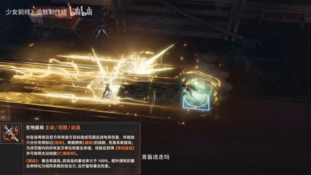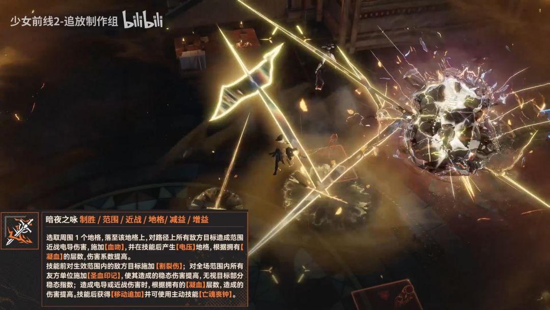 三技能的效果:造成范围近战电导伤害,并且根据【凝血】层数增加技能倍率,生成电导地格,并为范围内的队友回复生命并驱散减益。如果敌人有【血吻】debuff,则消耗【血吻】额外造成一段伤害,并获得【凝血】,如果敌人是精英或首领则额外获得层数。
